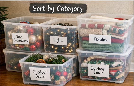 Before you start filling boxes, separate things into groups. This makes the process faster and makes it easier to find everything next year.